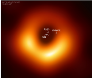 Image of the 6.5 billion solar mass black hole in the heart of M87. Once matter passes through the event horizon – the point of no return or in-falling light and matter – and into the void, it is never seen again in our universe