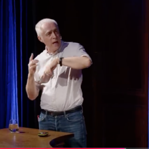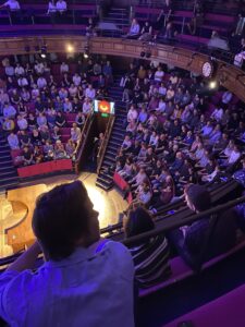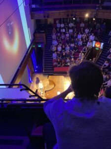 The Royal Institution lecture theatre is a lot smaller than it looks on TV! Here I am beneath a giant image of the black hole in the nearby galaxy, M87.